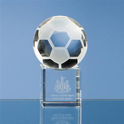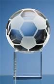 • Balle de football en verre posée sur un socle en verre transparent